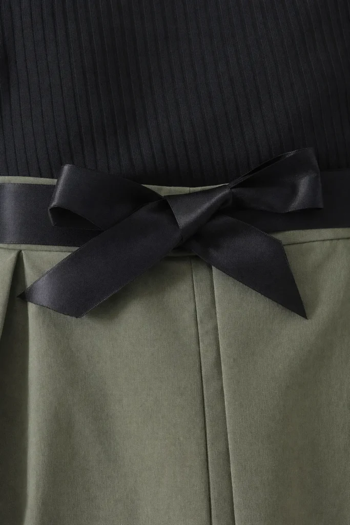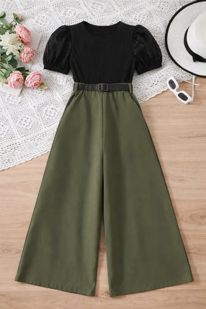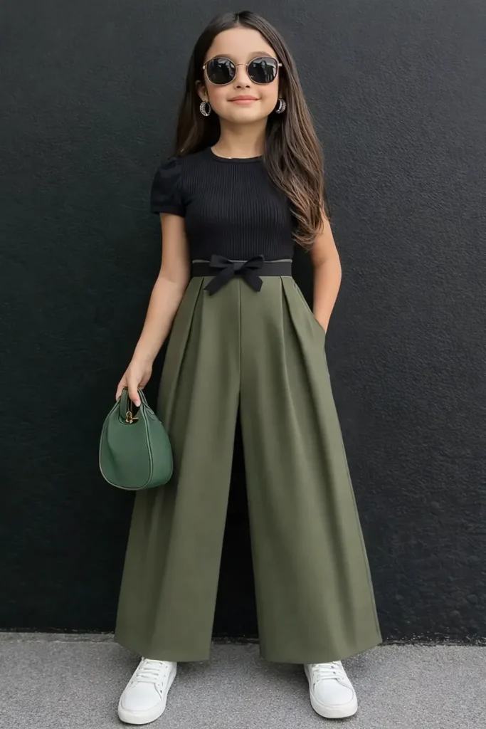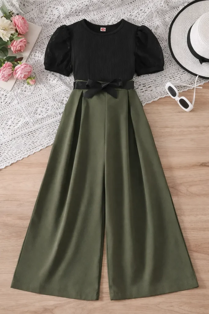امنحي طفلتك إطلالة تخطف الأنظار وتجمع بين الرقي الكلاسيكي والراحة اليومية مع هذا الطقم البناتي الفاخر، المصمم خصيصاً ليجعلها تبدو كأيقونة صغيرة للموضة في كافة الأوقات والمناسبات. يتألف الطقم من بلوزة سوداء أنيقة بنسيج مضلع عالي الجودة وأكمام قصيرة منفوخة قليلاً تضفي لمسة أنثوية رقيقة، متناسقة ببراعة مع بنطلون فضفاض وواسع الأرجل بلون أخضر زيتوني جذاب يواكب أحدث صيحات الموضة. يتميز البنطلون بخصر عالي مزين بحزام أسود ناعم يُعقد على شكل “فيونكة” ليربط بين القطعتين بتناغم تام، إلى جانب كسرات أمامية أنيقة وجيوب جانبية مخفية وعملية تضمن لها أقصى درجات حرية الحركة واللعب. بفضل تباين ألوانه الراقي وتصميمه الذكي متعدد الاستخدامات، يمكنكِ تنسيقه بسهولة مع حذاء رياضي أبيض ونظارات شمسية لإطلالة نهارية “كاجوال شيك”، أو مع حذاء كلاسيكي مسطح لمناسبة أكثر رسمية، مما يجعله الإضافة المثالية والمريحة لخزانة أميرتك الصغيرة لتتألق بثقة وأناقة لا تُنسى